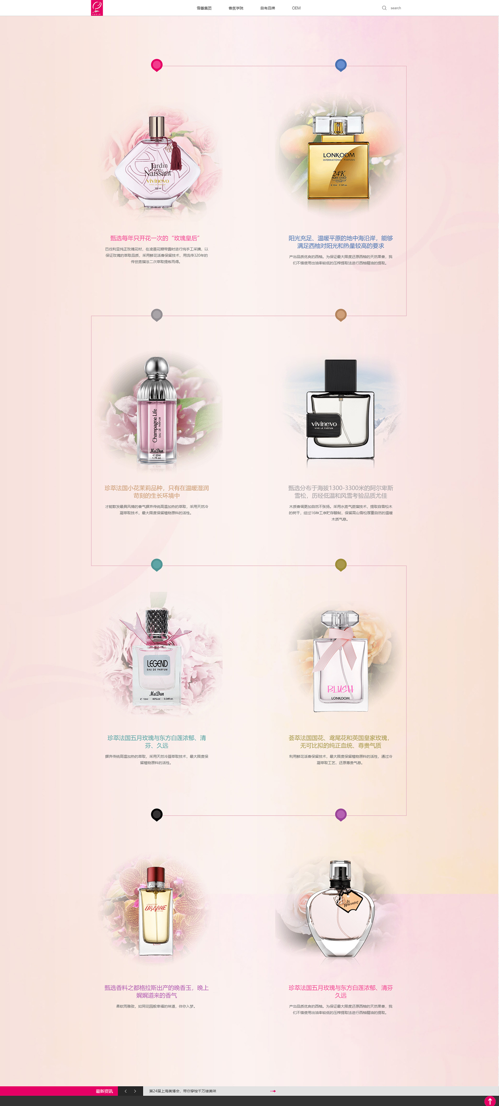 企業(yè)旗下?lián)碛芯S維尼奧、朗金和美頓三大自營品牌體系,集科研、生產(chǎn)、銷售于一體,產(chǎn)品涵蓋香水、家居香氛、藝術(shù)香氛、身體護理等香氛全品類,數(shù)百個香氛品種,上100種核心專利,更有OEM合作系統(tǒng),12條自動化生產(chǎn)線,年度產(chǎn)能達到5000萬瓶,并分別于2005年在迪拜、2008年在沙特、2010年在巴西成立分公司。