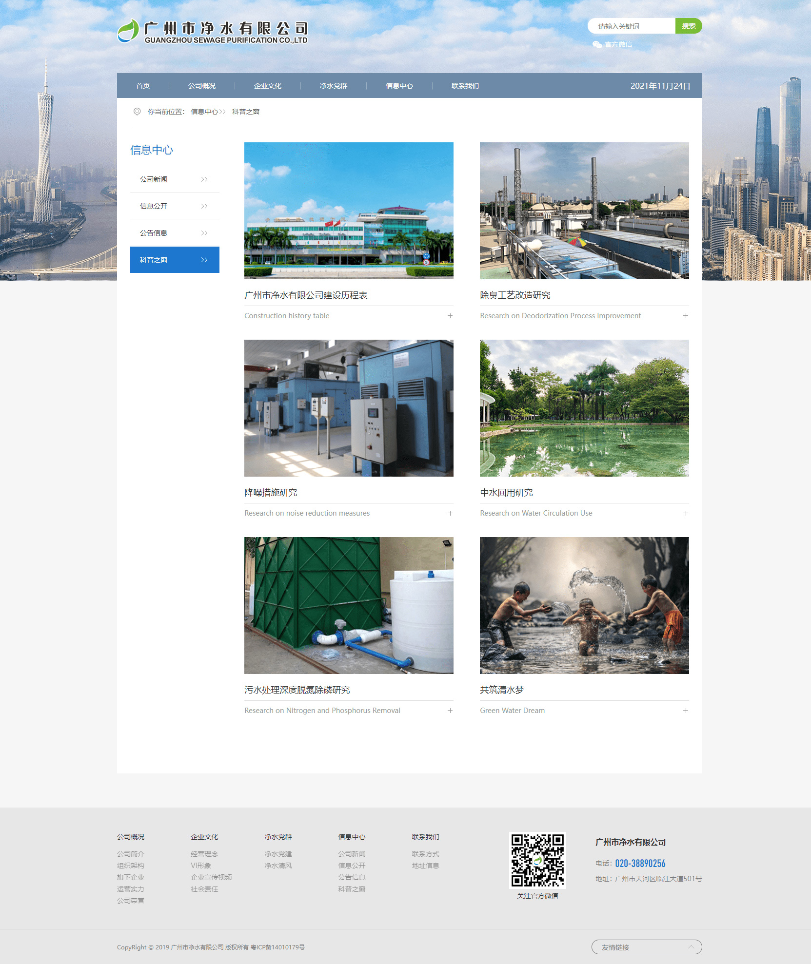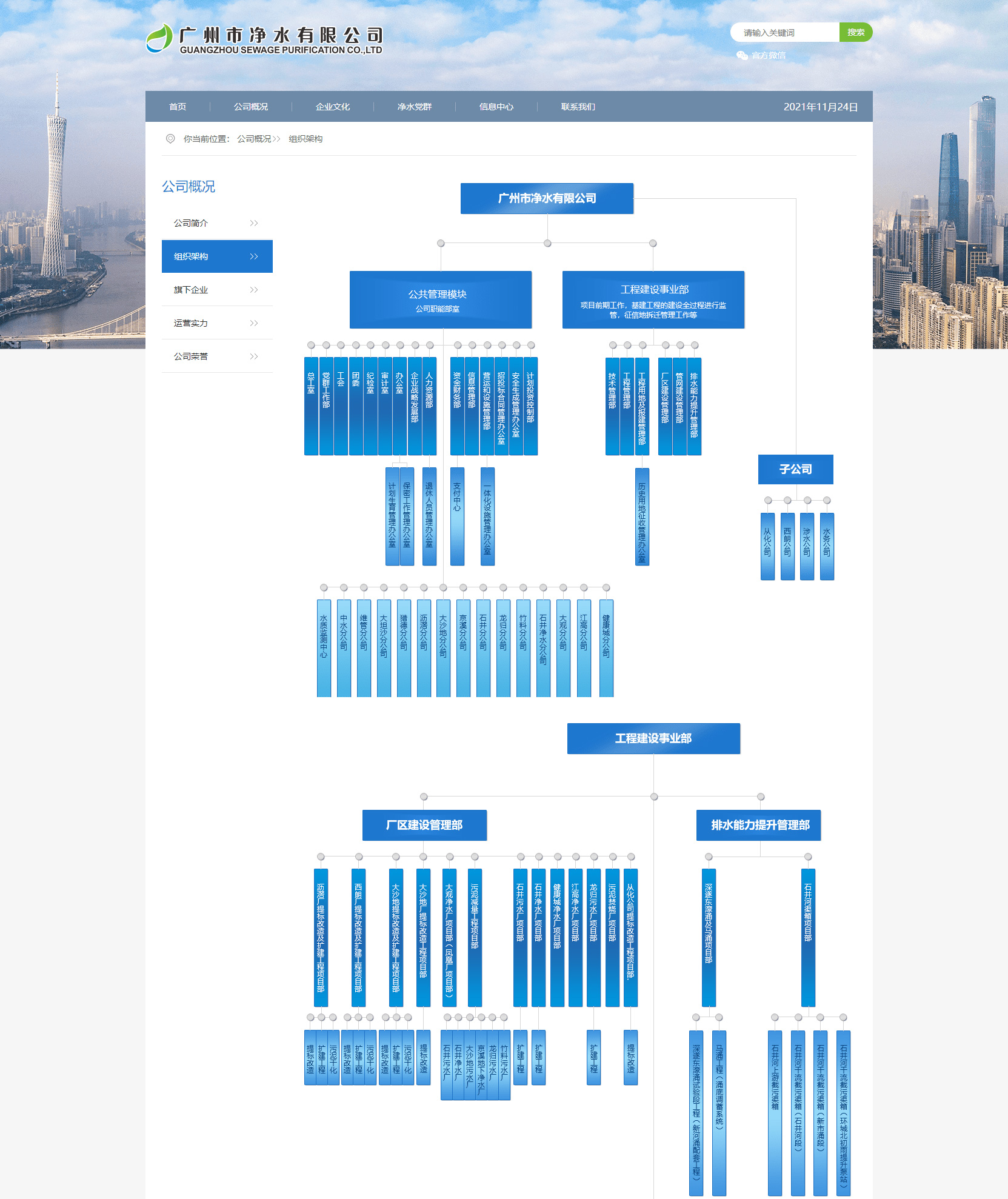 廣州市凈水有限公司是廣州市水務(wù)投資集團(tuán)有限公司的全資子公司,創(chuàng)建于1989年,發(fā)展至今已成為一家集污水處理、建設(shè)、運(yùn)營、資產(chǎn)經(jīng)營及研發(fā)為一體的特大型國有污水處理企業(yè)。