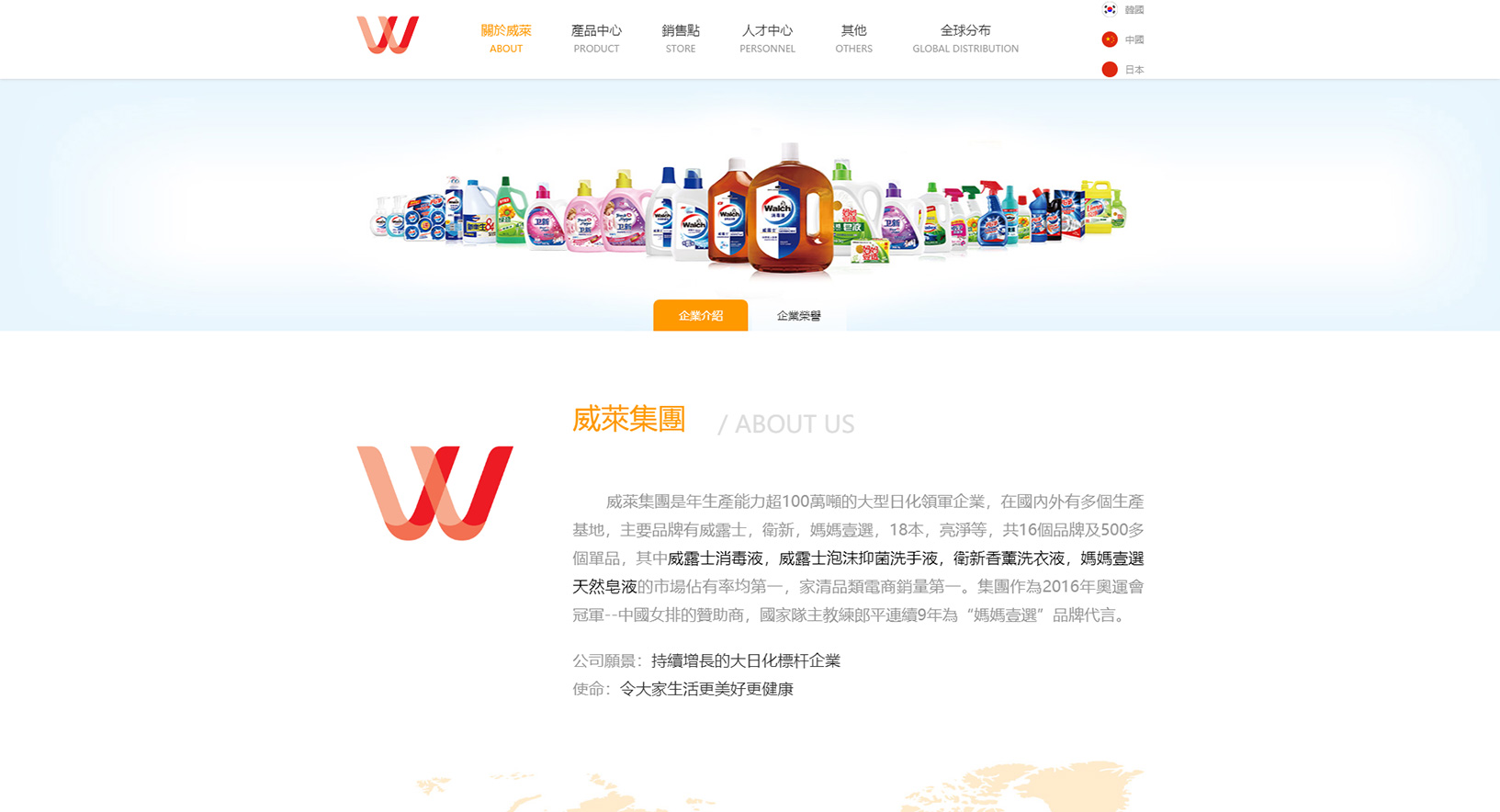 威萊集團是年生產(chǎn)能力超100萬噸的大型日化領(lǐng)軍企業(yè),在國內(nèi)外有多個生產(chǎn)基地,主要品牌有威露士,衛(wèi)新,媽媽壹選,18本,亮淨(jìng)等,共16個品牌及500多個單品,其中威露士消毒液,威露士泡沫抑菌洗手液,衛(wèi)新香薰洗衣液,媽媽壹選天然皂液的市場佔有率均第一,家清品類電商銷量第一。集團作為2016年奧運會冠軍--中國女排的贊助商,國家隊主教練郎平連續(xù)9年為“媽媽壹選”品牌代言。